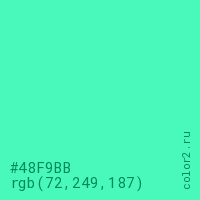 Цвет #48F9BB в цветовой модели RGB обозначается тремя октетами (72, 249, 187) в десятичном формате и #48F9BB в шестнадцатиричном (hex) формате, которые являются интенсивностью красного 72 (hex 48), интенсивность зелёного 249 (hex F9) и интенсивность синего 187 (hex BB).