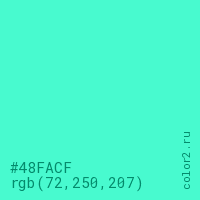Цвет #48FACF в цветовой модели RGB обозначается тремя октетами (72, 250, 207) в десятичном формате и #48FACF в шестнадцатиричном (hex) формате, которые являются интенсивностью красного 72 (hex 48), интенсивность зелёного 250 (hex FA) и интенсивность синего 207 (hex CF).