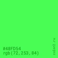 Цвет #48FD54 в цветовой модели RGB обозначается тремя октетами (72, 253, 84) в десятичном формате и #48FD54 в шестнадцатиричном (hex) формате, которые являются интенсивностью красного 72 (hex 48), интенсивность зелёного 253 (hex FD) и интенсивность синего 84 (hex 54).