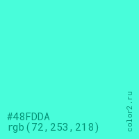 Цвет #48FDDA в цветовой модели RGB обозначается тремя октетами (72, 253, 218) в десятичном формате и #48FDDA в шестнадцатиричном (hex) формате, которые являются интенсивностью красного 72 (hex 48), интенсивность зелёного 253 (hex FD) и интенсивность синего 218 (hex DA).