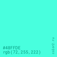 Цвет #48FFDE в цветовой модели RGB обозначается тремя октетами (72, 255, 222) в десятичном формате и #48FFDE в шестнадцатиричном (hex) формате, которые являются интенсивностью красного 72 (hex 48), интенсивность зелёного 255 (hex FF) и интенсивность синего 222 (hex DE).