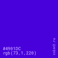 Цвет #4901DC в цветовой модели RGB обозначается тремя октетами (73, 1, 220) в десятичном формате и #4901DC в шестнадцатиричном (hex) формате, которые являются интенсивностью красного 73 (hex 49), интенсивность зелёного 1 (hex 01) и интенсивность синего 220 (hex DC).