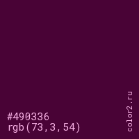 Цвет #490336 в цветовой модели RGB обозначается тремя октетами (73, 3, 54) в десятичном формате и #490336 в шестнадцатиричном (hex) формате, которые являются интенсивностью красного 73 (hex 49), интенсивность зелёного 3 (hex 03) и интенсивность синего 54 (hex 36).