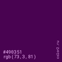 Цвет #490351 в цветовой модели RGB обозначается тремя октетами (73, 3, 81) в десятичном формате и #490351 в шестнадцатиричном (hex) формате, которые являются интенсивностью красного 73 (hex 49), интенсивность зелёного 3 (hex 03) и интенсивность синего 81 (hex 51).