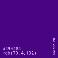 Цвет #490484 в цветовой модели RGB обозначается тремя октетами (73, 4, 132) в десятичном формате и #490484 в шестнадцатиричном (hex) формате, которые являются интенсивностью красного 73 (hex 49), интенсивность зелёного 4 (hex 04) и интенсивность синего 132 (hex 84).