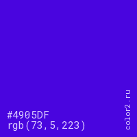 Цвет #4905DF в цветовой модели RGB обозначается тремя октетами (73, 5, 223) в десятичном формате и #4905DF в шестнадцатиричном (hex) формате, которые являются интенсивностью красного 73 (hex 49), интенсивность зелёного 5 (hex 05) и интенсивность синего 223 (hex DF).