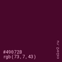 Цвет #49072B в цветовой модели RGB обозначается тремя октетами (73, 7, 43) в десятичном формате и #49072B в шестнадцатиричном (hex) формате, которые являются интенсивностью красного 73 (hex 49), интенсивность зелёного 7 (hex 07) и интенсивность синего 43 (hex 2B).
