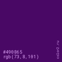 Цвет #490865 в цветовой модели RGB обозначается тремя октетами (73, 8, 101) в десятичном формате и #490865 в шестнадцатиричном (hex) формате, которые являются интенсивностью красного 73 (hex 49), интенсивность зелёного 8 (hex 08) и интенсивность синего 101 (hex 65).