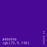 Цвет #490996 в цветовой модели RGB обозначается тремя октетами (73, 9, 150) в десятичном формате и #490996 в шестнадцатиричном (hex) формате, которые являются интенсивностью красного 73 (hex 49), интенсивность зелёного 9 (hex 09) и интенсивность синего 150 (hex 96).