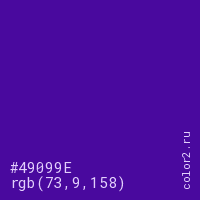 Цвет #49099E в цветовой модели RGB обозначается тремя октетами (73, 9, 158) в десятичном формате и #49099E в шестнадцатиричном (hex) формате, которые являются интенсивностью красного 73 (hex 49), интенсивность зелёного 9 (hex 09) и интенсивность синего 158 (hex 9E).