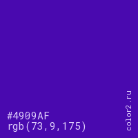 Цвет #4909AF в цветовой модели RGB обозначается тремя октетами (73, 9, 175) в десятичном формате и #4909AF в шестнадцатиричном (hex) формате, которые являются интенсивностью красного 73 (hex 49), интенсивность зелёного 9 (hex 09) и интенсивность синего 175 (hex AF).