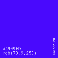 Цвет #4909FD в цветовой модели RGB обозначается тремя октетами (73, 9, 253) в десятичном формате и #4909FD в шестнадцатиричном (hex) формате, которые являются интенсивностью красного 73 (hex 49), интенсивность зелёного 9 (hex 09) и интенсивность синего 253 (hex FD).