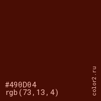 Цвет #490D04 в цветовой модели RGB обозначается тремя октетами (73, 13, 4) в десятичном формате и #490D04 в шестнадцатиричном (hex) формате, которые являются интенсивностью красного 73 (hex 49), интенсивность зелёного 13 (hex 0D) и интенсивность синего 4 (hex 04).
