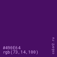 Цвет #490E64 в цветовой модели RGB обозначается тремя октетами (73, 14, 100) в десятичном формате и #490E64 в шестнадцатиричном (hex) формате, которые являются интенсивностью красного 73 (hex 49), интенсивность зелёного 14 (hex 0E) и интенсивность синего 100 (hex 64).