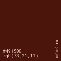 Цвет #49150B в цветовой модели RGB обозначается тремя октетами (73, 21, 11) в десятичном формате и #49150B в шестнадцатиричном (hex) формате, которые являются интенсивностью красного 73 (hex 49), интенсивность зелёного 21 (hex 15) и интенсивность синего 11 (hex 0B).