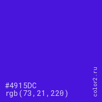 Цвет #4915DC в цветовой модели RGB обозначается тремя октетами (73, 21, 220) в десятичном формате и #4915DC в шестнадцатиричном (hex) формате, которые являются интенсивностью красного 73 (hex 49), интенсивность зелёного 21 (hex 15) и интенсивность синего 220 (hex DC).