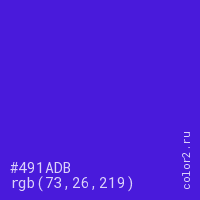 Цвет #491ADB в цветовой модели RGB обозначается тремя октетами (73, 26, 219) в десятичном формате и #491ADB в шестнадцатиричном (hex) формате, которые являются интенсивностью красного 73 (hex 49), интенсивность зелёного 26 (hex 1A) и интенсивность синего 219 (hex DB).