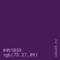 Цвет #491B59 в цветовой модели RGB обозначается тремя октетами (73, 27, 89) в десятичном формате и #491B59 в шестнадцатиричном (hex) формате, которые являются интенсивностью красного 73 (hex 49), интенсивность зелёного 27 (hex 1B) и интенсивность синего 89 (hex 59).