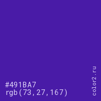 Цвет #491BA7 в цветовой модели RGB обозначается тремя октетами (73, 27, 167) в десятичном формате и #491BA7 в шестнадцатиричном (hex) формате, которые являются интенсивностью красного 73 (hex 49), интенсивность зелёного 27 (hex 1B) и интенсивность синего 167 (hex A7).
