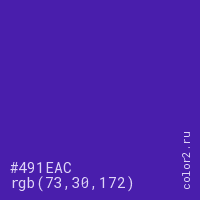 Цвет #491EAC в цветовой модели RGB обозначается тремя октетами (73, 30, 172) в десятичном формате и #491EAC в шестнадцатиричном (hex) формате, которые являются интенсивностью красного 73 (hex 49), интенсивность зелёного 30 (hex 1E) и интенсивность синего 172 (hex AC).