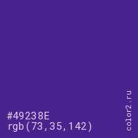 Цвет #49238E в цветовой модели RGB обозначается тремя октетами (73, 35, 142) в десятичном формате и #49238E в шестнадцатиричном (hex) формате, которые являются интенсивностью красного 73 (hex 49), интенсивность зелёного 35 (hex 23) и интенсивность синего 142 (hex 8E).