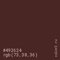 Цвет #492624 в цветовой модели RGB обозначается тремя октетами (73, 38, 36) в десятичном формате и #492624 в шестнадцатиричном (hex) формате, которые являются интенсивностью красного 73 (hex 49), интенсивность зелёного 38 (hex 26) и интенсивность синего 36 (hex 24).