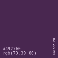 Цвет #492750 в цветовой модели RGB обозначается тремя октетами (73, 39, 80) в десятичном формате и #492750 в шестнадцатиричном (hex) формате, которые являются интенсивностью красного 73 (hex 49), интенсивность зелёного 39 (hex 27) и интенсивность синего 80 (hex 50).