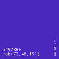 Цвет #4928BF в цветовой модели RGB обозначается тремя октетами (73, 40, 191) в десятичном формате и #4928BF в шестнадцатиричном (hex) формате, которые являются интенсивностью красного 73 (hex 49), интенсивность зелёного 40 (hex 28) и интенсивность синего 191 (hex BF).