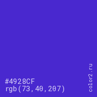 Цвет #4928CF в цветовой модели RGB обозначается тремя октетами (73, 40, 207) в десятичном формате и #4928CF в шестнадцатиричном (hex) формате, которые являются интенсивностью красного 73 (hex 49), интенсивность зелёного 40 (hex 28) и интенсивность синего 207 (hex CF).