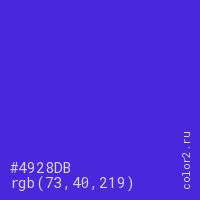 Цвет #4928DB в цветовой модели RGB обозначается тремя октетами (73, 40, 219) в десятичном формате и #4928DB в шестнадцатиричном (hex) формате, которые являются интенсивностью красного 73 (hex 49), интенсивность зелёного 40 (hex 28) и интенсивность синего 219 (hex DB).