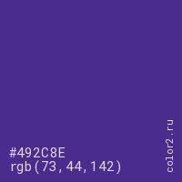 Цвет #492C8E в цветовой модели RGB обозначается тремя октетами (73, 44, 142) в десятичном формате и #492C8E в шестнадцатиричном (hex) формате, которые являются интенсивностью красного 73 (hex 49), интенсивность зелёного 44 (hex 2C) и интенсивность синего 142 (hex 8E).