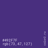 Цвет #492F7F в цветовой модели RGB обозначается тремя октетами (73, 47, 127) в десятичном формате и #492F7F в шестнадцатиричном (hex) формате, которые являются интенсивностью красного 73 (hex 49), интенсивность зелёного 47 (hex 2F) и интенсивность синего 127 (hex 7F).