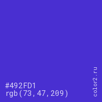 Цвет #492FD1 в цветовой модели RGB обозначается тремя октетами (73, 47, 209) в десятичном формате и #492FD1 в шестнадцатиричном (hex) формате, которые являются интенсивностью красного 73 (hex 49), интенсивность зелёного 47 (hex 2F) и интенсивность синего 209 (hex D1).
