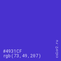 Цвет #4931CF в цветовой модели RGB обозначается тремя октетами (73, 49, 207) в десятичном формате и #4931CF в шестнадцатиричном (hex) формате, которые являются интенсивностью красного 73 (hex 49), интенсивность зелёного 49 (hex 31) и интенсивность синего 207 (hex CF).