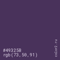 Цвет #49325B в цветовой модели RGB обозначается тремя октетами (73, 50, 91) в десятичном формате и #49325B в шестнадцатиричном (hex) формате, которые являются интенсивностью красного 73 (hex 49), интенсивность зелёного 50 (hex 32) и интенсивность синего 91 (hex 5B).