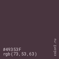 Цвет #49353F в цветовой модели RGB обозначается тремя октетами (73, 53, 63) в десятичном формате и #49353F в шестнадцатиричном (hex) формате, которые являются интенсивностью красного 73 (hex 49), интенсивность зелёного 53 (hex 35) и интенсивность синего 63 (hex 3F).