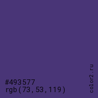 Цвет #493577 в цветовой модели RGB обозначается тремя октетами (73, 53, 119) в десятичном формате и #493577 в шестнадцатиричном (hex) формате, которые являются интенсивностью красного 73 (hex 49), интенсивность зелёного 53 (hex 35) и интенсивность синего 119 (hex 77).