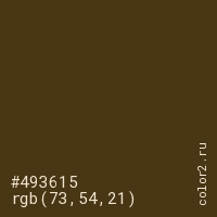 Цвет #493615 в цветовой модели RGB обозначается тремя октетами (73, 54, 21) в десятичном формате и #493615 в шестнадцатиричном (hex) формате, которые являются интенсивностью красного 73 (hex 49), интенсивность зелёного 54 (hex 36) и интенсивность синего 21 (hex 15).