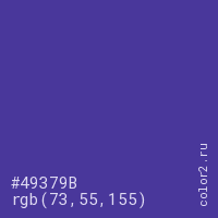 Цвет #49379B в цветовой модели RGB обозначается тремя октетами (73, 55, 155) в десятичном формате и #49379B в шестнадцатиричном (hex) формате, которые являются интенсивностью красного 73 (hex 49), интенсивность зелёного 55 (hex 37) и интенсивность синего 155 (hex 9B).