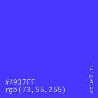 Цвет #4937FF в цветовой модели RGB обозначается тремя октетами (73, 55, 255) в десятичном формате и #4937FF в шестнадцатиричном (hex) формате, которые являются интенсивностью красного 73 (hex 49), интенсивность зелёного 55 (hex 37) и интенсивность синего 255 (hex FF).