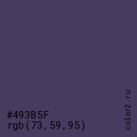 Цвет #493B5F в цветовой модели RGB обозначается тремя октетами (73, 59, 95) в десятичном формате и #493B5F в шестнадцатиричном (hex) формате, которые являются интенсивностью красного 73 (hex 49), интенсивность зелёного 59 (hex 3B) и интенсивность синего 95 (hex 5F).