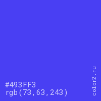 Цвет #493FF3 в цветовой модели RGB обозначается тремя октетами (73, 63, 243) в десятичном формате и #493FF3 в шестнадцатиричном (hex) формате, которые являются интенсивностью красного 73 (hex 49), интенсивность зелёного 63 (hex 3F) и интенсивность синего 243 (hex F3).