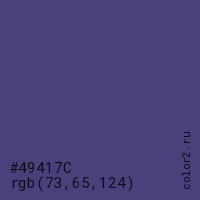 Цвет #49417C в цветовой модели RGB обозначается тремя октетами (73, 65, 124) в десятичном формате и #49417C в шестнадцатиричном (hex) формате, которые являются интенсивностью красного 73 (hex 49), интенсивность зелёного 65 (hex 41) и интенсивность синего 124 (hex 7C).