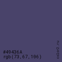 Цвет #49436A в цветовой модели RGB обозначается тремя октетами (73, 67, 106) в десятичном формате и #49436A в шестнадцатиричном (hex) формате, которые являются интенсивностью красного 73 (hex 49), интенсивность зелёного 67 (hex 43) и интенсивность синего 106 (hex 6A).