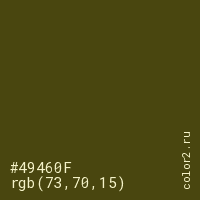 Цвет #49460F в цветовой модели RGB обозначается тремя октетами (73, 70, 15) в десятичном формате и #49460F в шестнадцатиричном (hex) формате, которые являются интенсивностью красного 73 (hex 49), интенсивность зелёного 70 (hex 46) и интенсивность синего 15 (hex 0F).