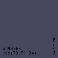Цвет #49475E в цветовой модели RGB обозначается тремя октетами (73, 71, 94) в десятичном формате и #49475E в шестнадцатиричном (hex) формате, которые являются интенсивностью красного 73 (hex 49), интенсивность зелёного 71 (hex 47) и интенсивность синего 94 (hex 5E).
