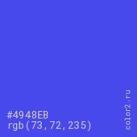 Цвет #4948EB в цветовой модели RGB обозначается тремя октетами (73, 72, 235) в десятичном формате и #4948EB в шестнадцатиричном (hex) формате, которые являются интенсивностью красного 73 (hex 49), интенсивность зелёного 72 (hex 48) и интенсивность синего 235 (hex EB).
