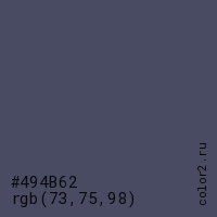 Цвет #494B62 в цветовой модели RGB обозначается тремя октетами (73, 75, 98) в десятичном формате и #494B62 в шестнадцатиричном (hex) формате, которые являются интенсивностью красного 73 (hex 49), интенсивность зелёного 75 (hex 4B) и интенсивность синего 98 (hex 62).