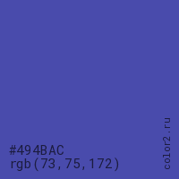 Цвет #494BAC в цветовой модели RGB обозначается тремя октетами (73, 75, 172) в десятичном формате и #494BAC в шестнадцатиричном (hex) формате, которые являются интенсивностью красного 73 (hex 49), интенсивность зелёного 75 (hex 4B) и интенсивность синего 172 (hex AC).