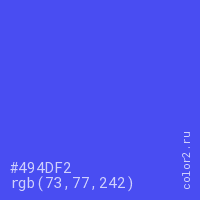 Цвет #494DF2 в цветовой модели RGB обозначается тремя октетами (73, 77, 242) в десятичном формате и #494DF2 в шестнадцатиричном (hex) формате, которые являются интенсивностью красного 73 (hex 49), интенсивность зелёного 77 (hex 4D) и интенсивность синего 242 (hex F2).